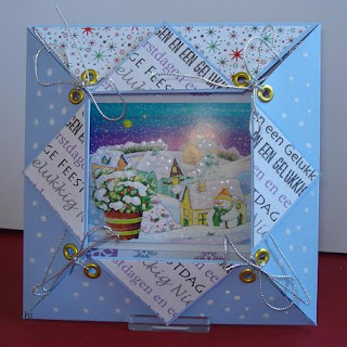 Het is een 20 cm.20 cm cardstock, je moet het midden daarvanop zoeken en dan de punten naar het midden vouwen, dan krijg je een soort envelop.Nu dan weer de punten naar de onderkant terugvouwen en versieren met scrappapier.